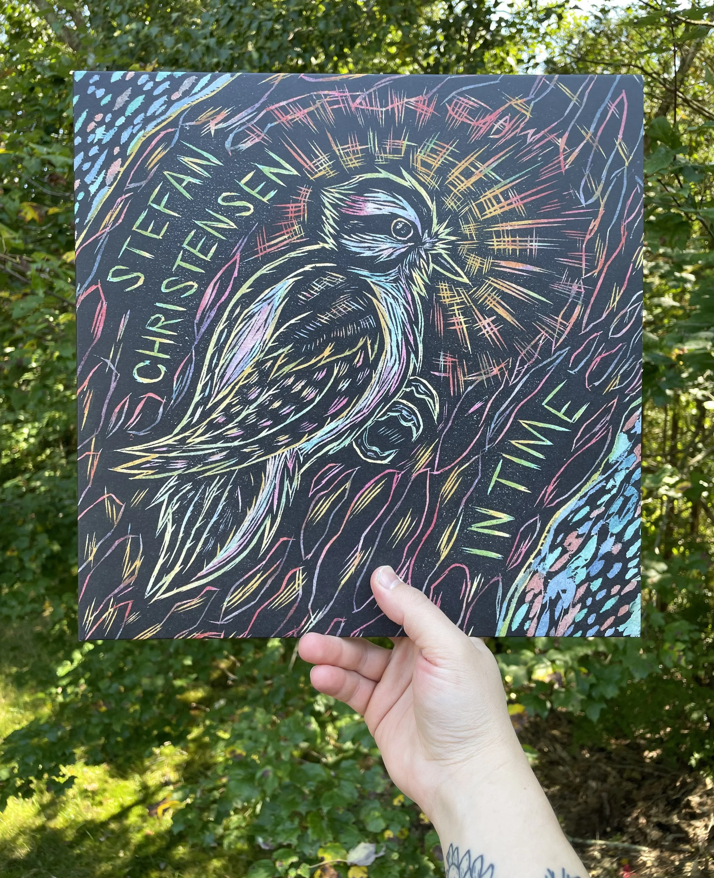 Full album jacket and insert layout artwork for Stefan Christensen's 2024 LP "In Time" released through C/Site Recordings. There are four hand-colored woodcut print images in all, this is the front cover. To listen to and purchase this record: https://stefanchristensen.bandcamp.com/album/in-time